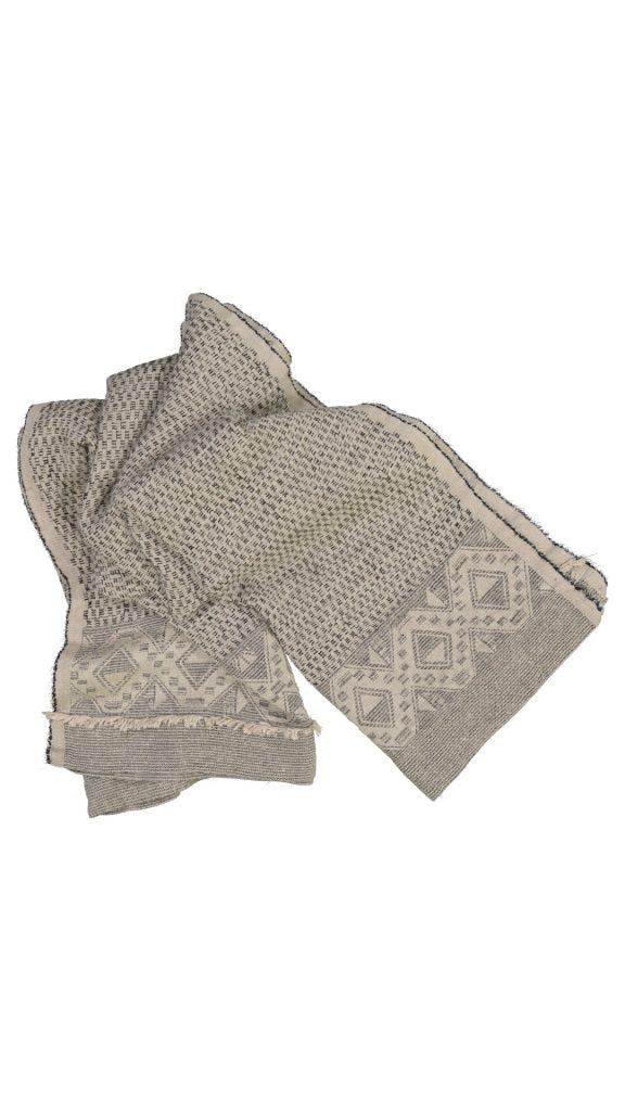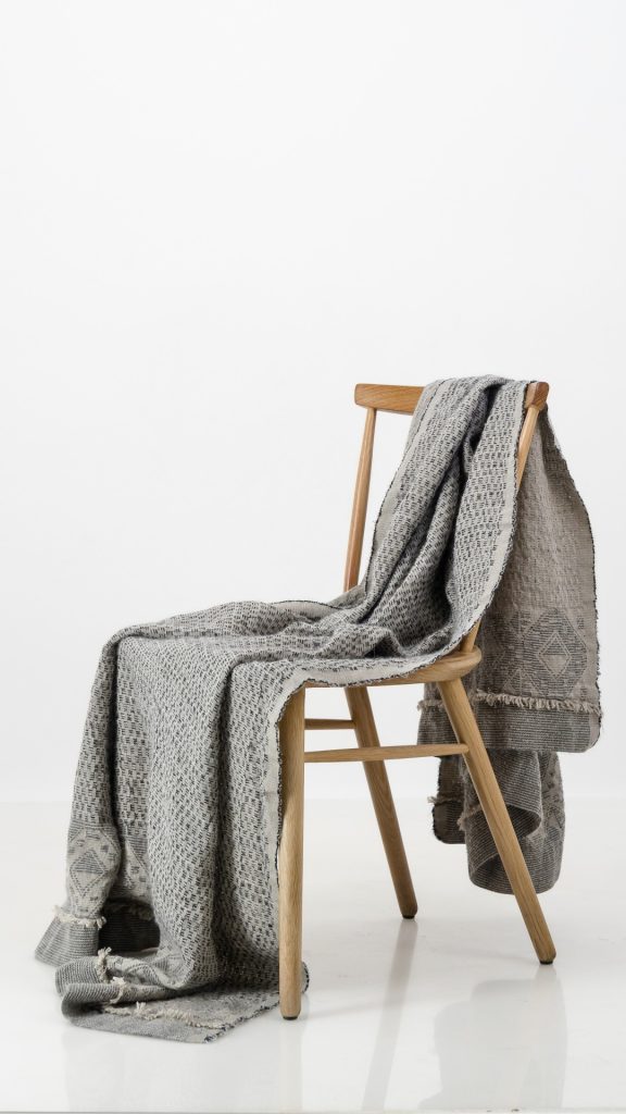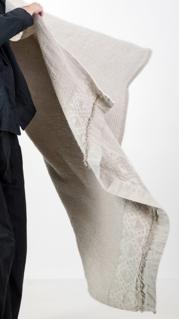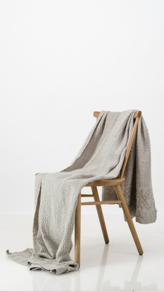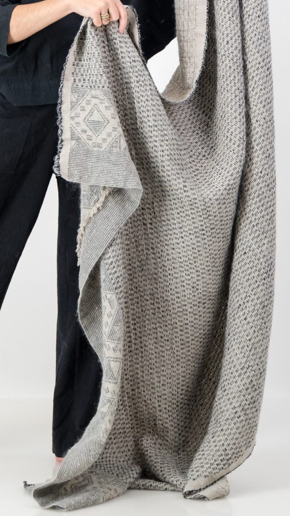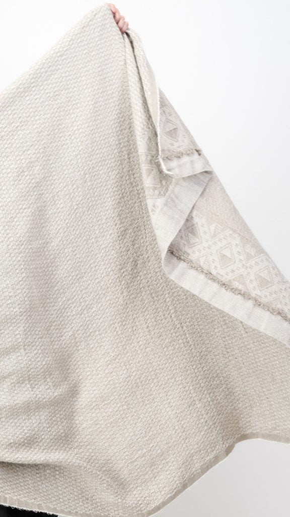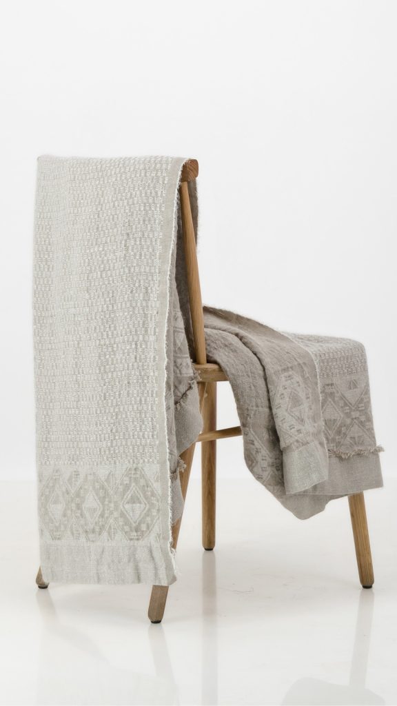 Woven with a blend that feels like sunlight on the skin. Breathable linen, airy mohair, and the subtle shimmer of silk. Woven on Jacquard looms, this piece is as breathable as it is warm. Perfect for those who seek comfort without weight. Ideal for layering across a bed or draping over a sofa, it moves easily between spaces and seasons.