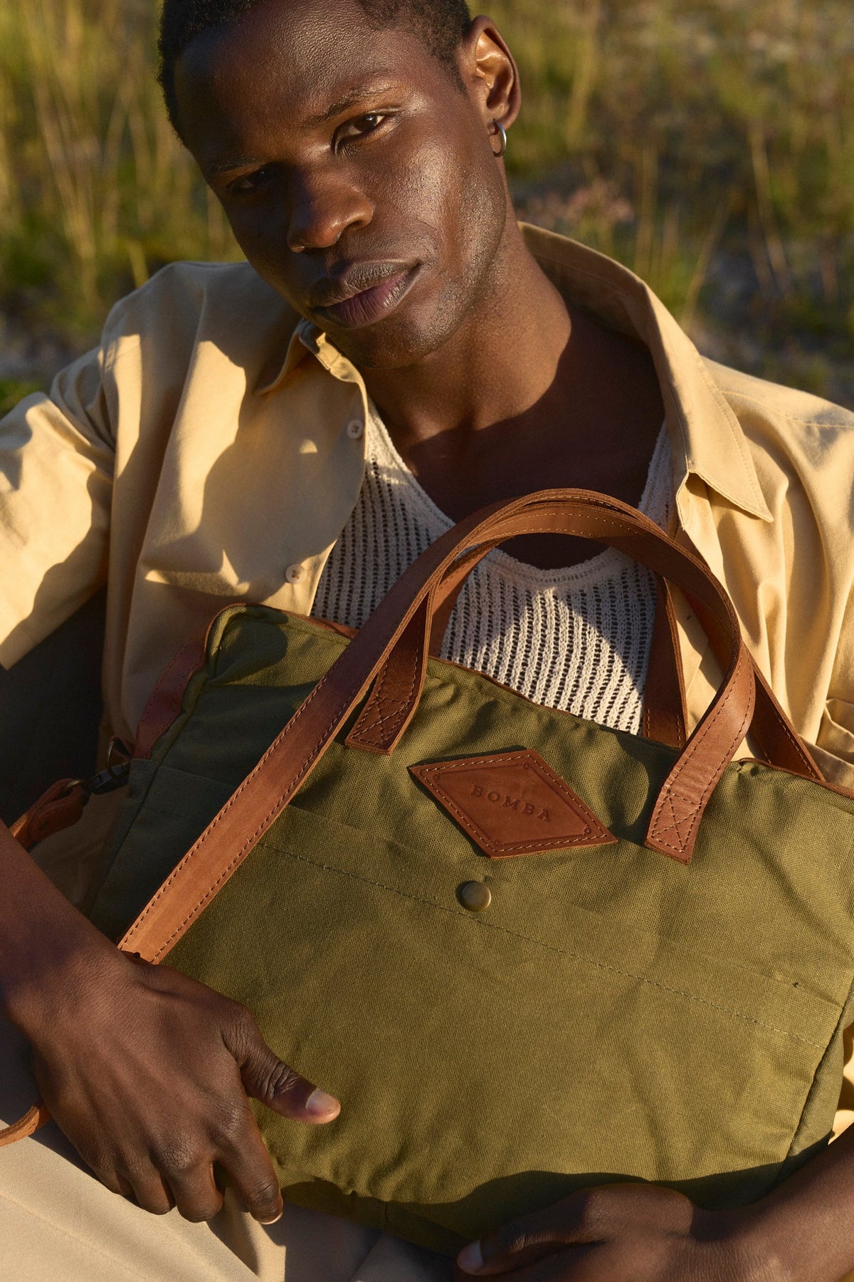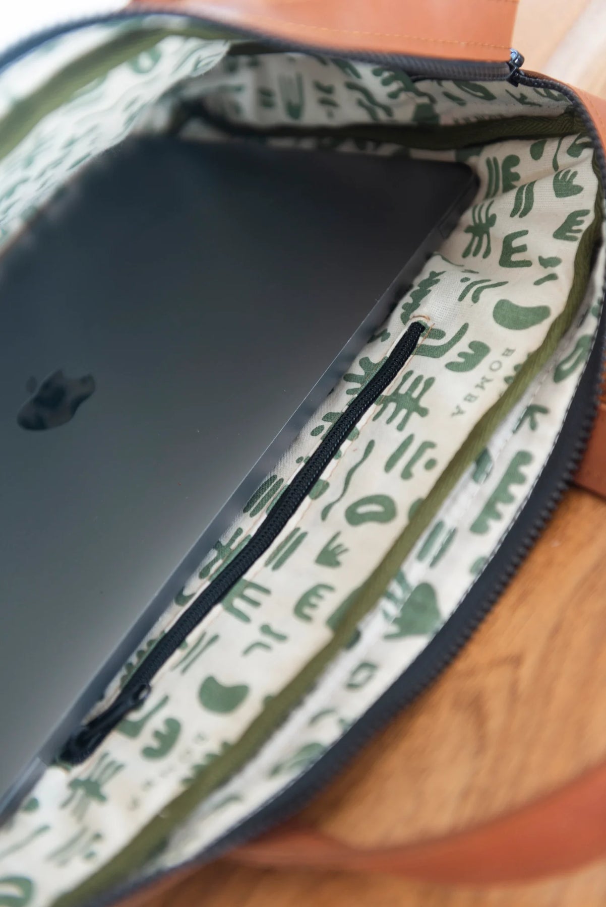 Leather handles and edges, as well as a leather sling strap included. It is padded both on the front and back and has a zipped pocket inside as well as a zip closing the trop of the bag. It also has a front pocket that closes with a stud.