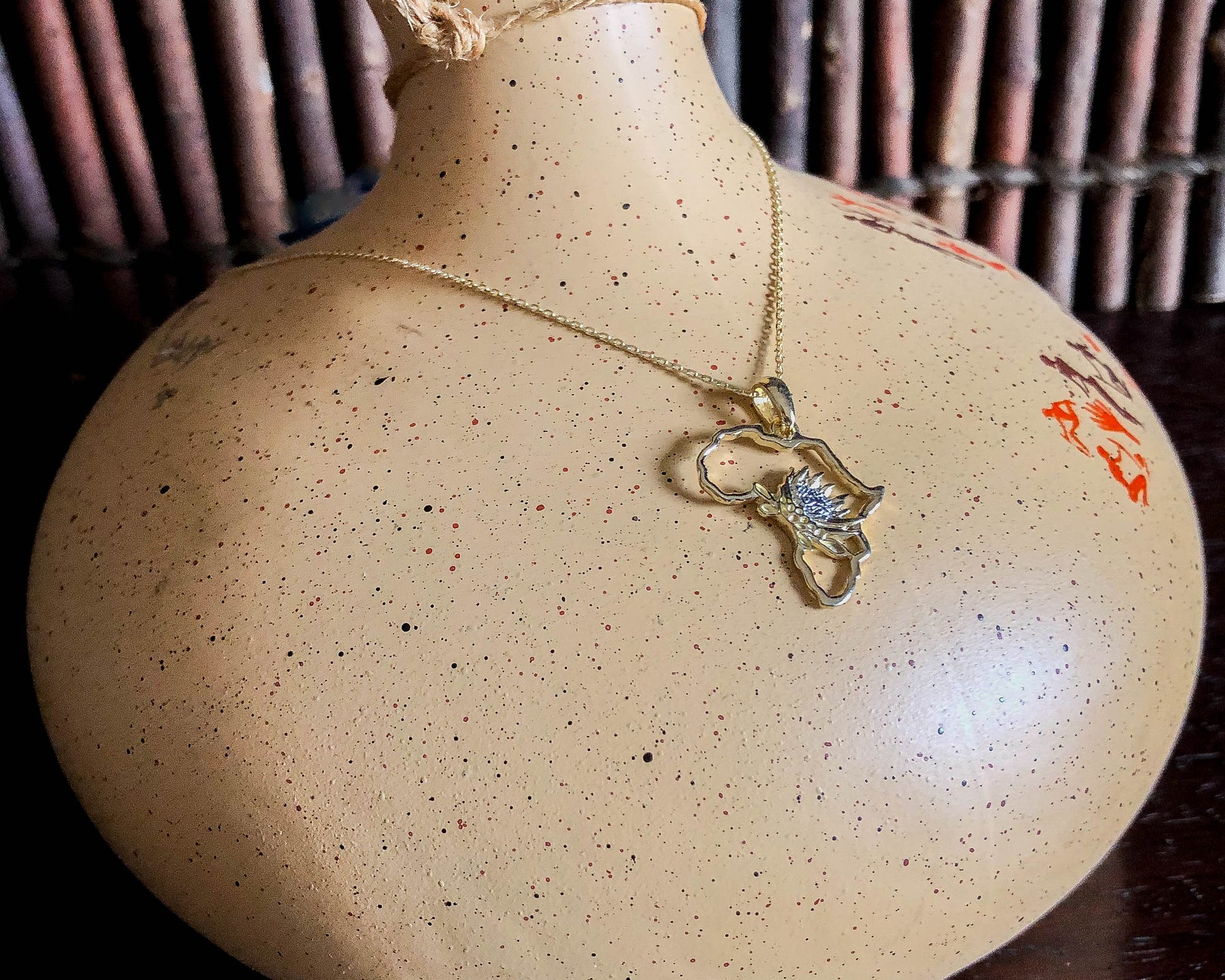 Diagonally set in a gold tracing of the map of Africa, South Africa's national flower, the exquisite protea, is artfully recreated in this gorgeous pendant. The petals and leaves are crafted in nine-carat yellow gold, and the flower sits at an angle against the west coast of Africa. This is both a homage to Africa and the biodiversity of our wild continent.