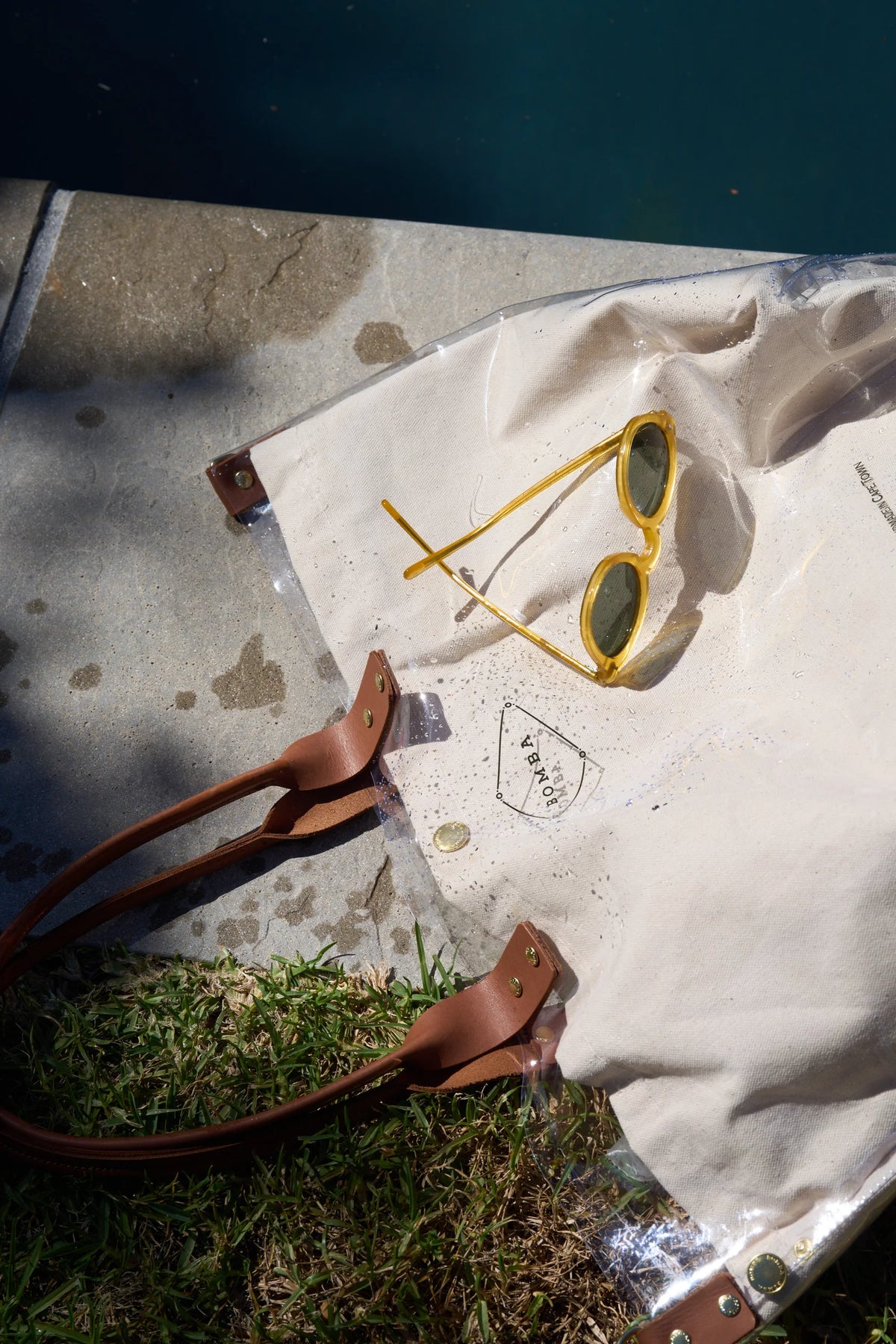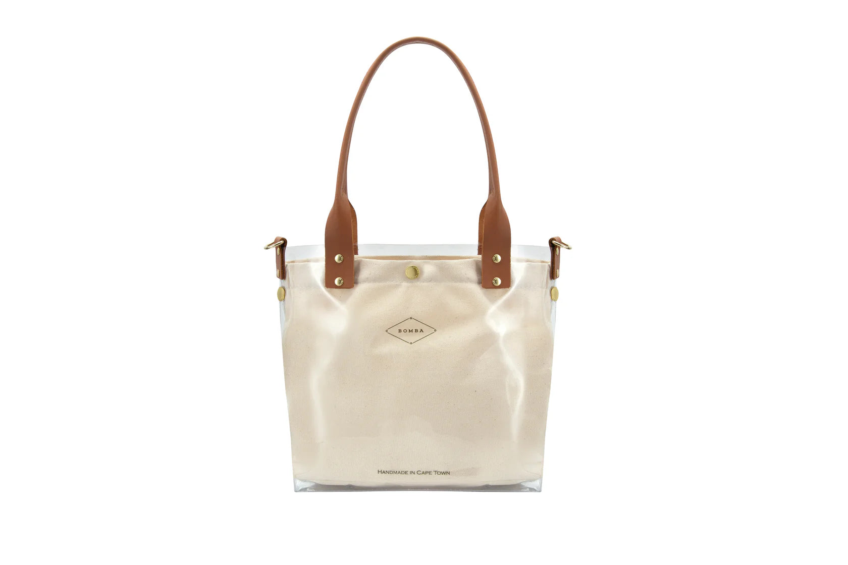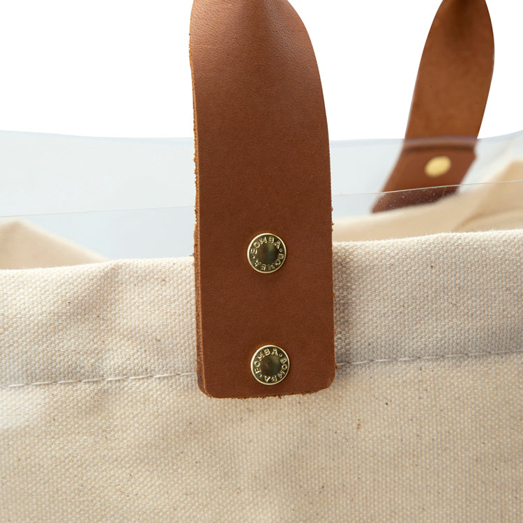 Made of a PVC shell, and an off white canvas removable pouch inside.