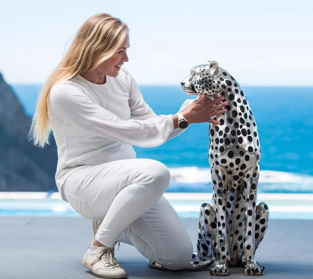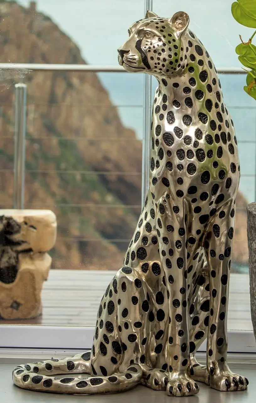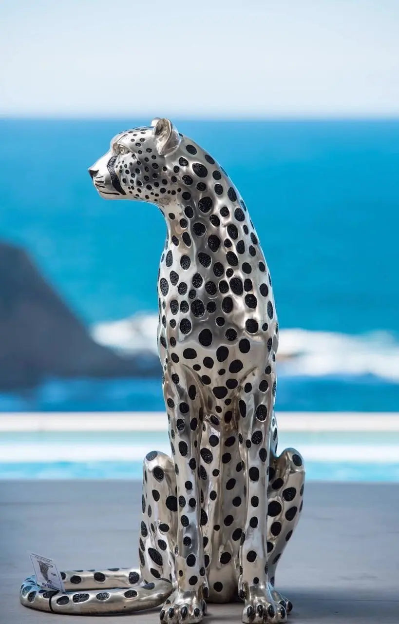 The Cheetah Sitting Life Size Silver Sculpture: Height = 91cm / 36in