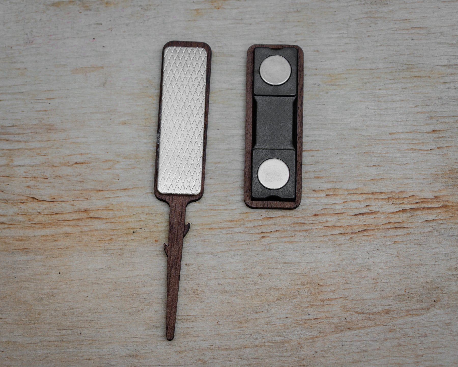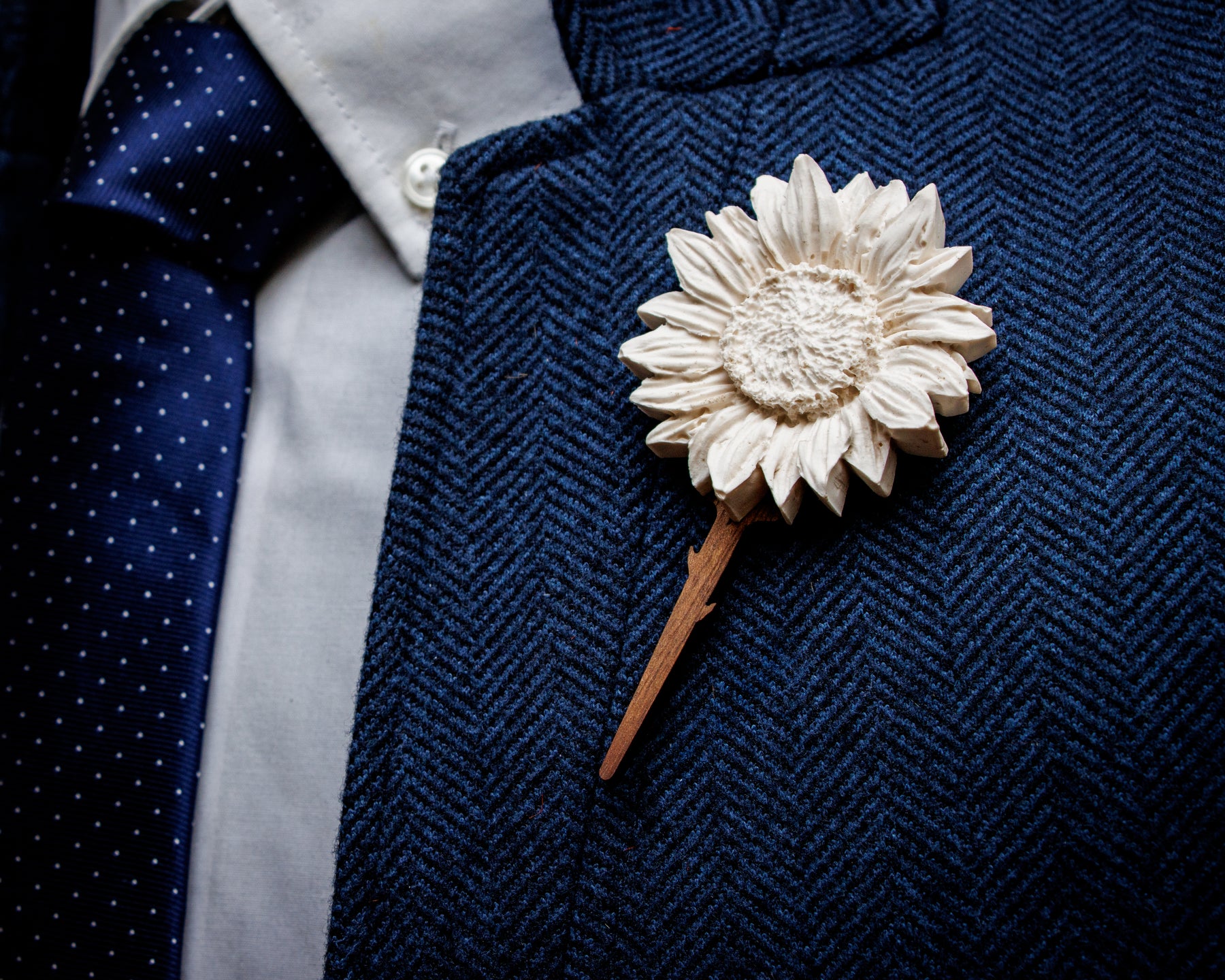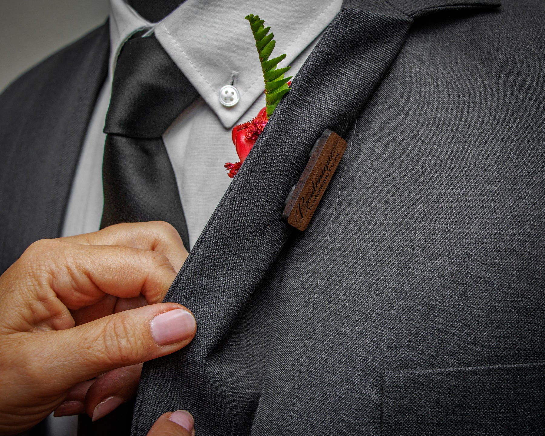 Boutonique replaces the traditional pin with a magnetic fastening designed specifically for boutonnieres. A small backing magnet sits discreetly behind the lapel or garment, while the floral holder rests in front.