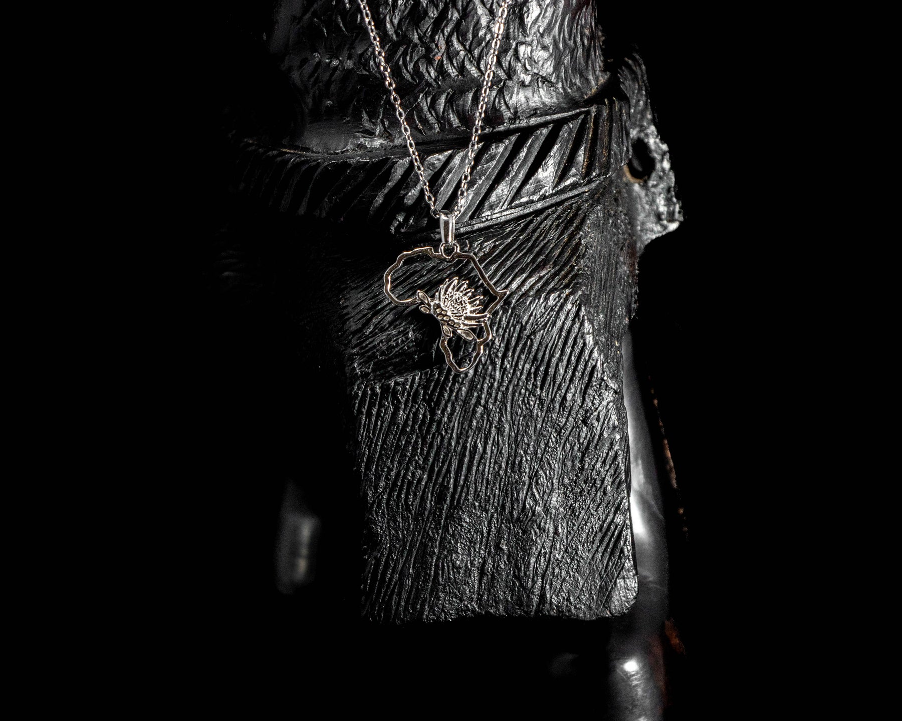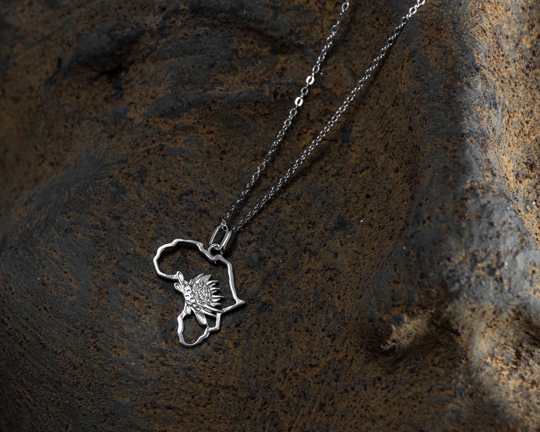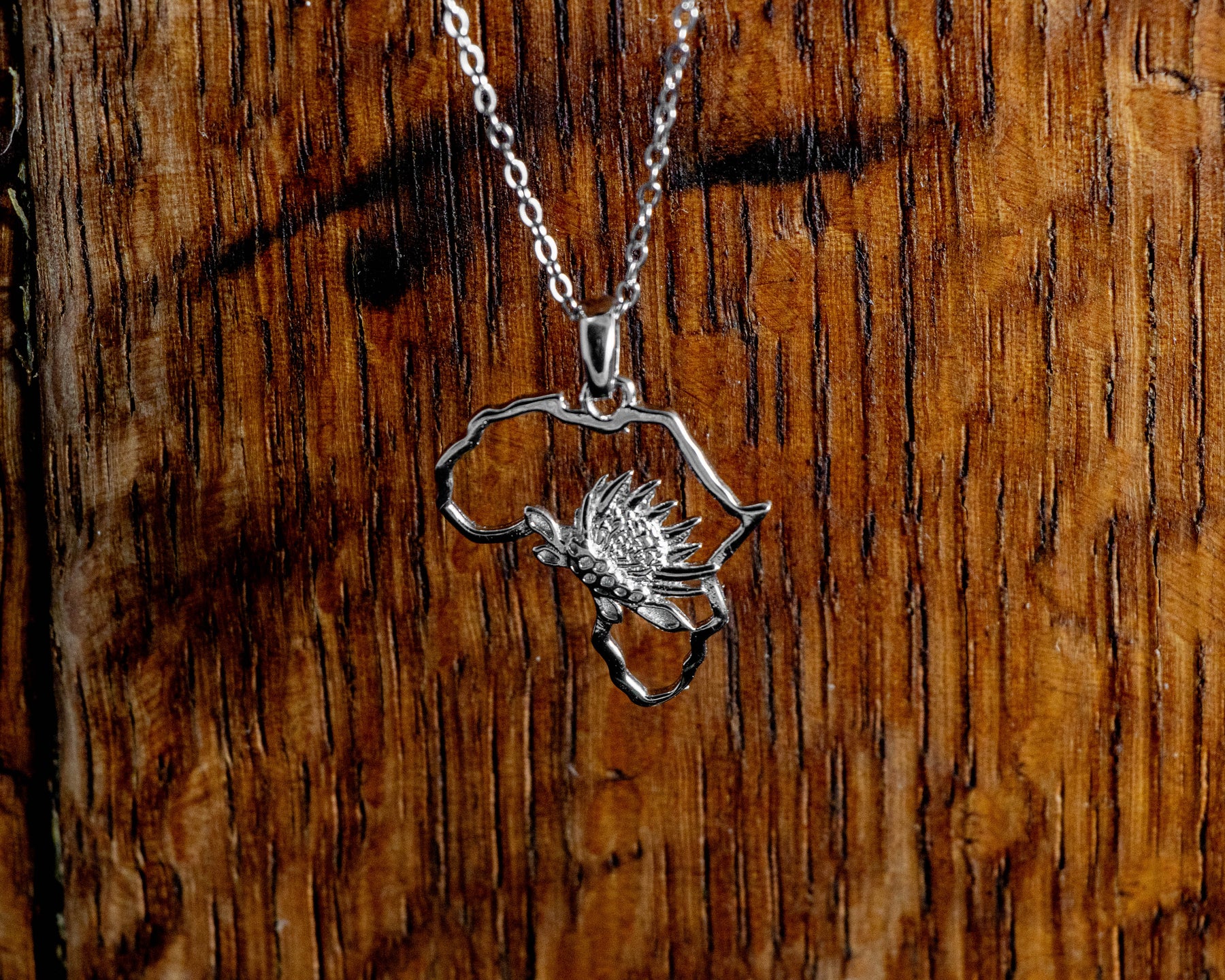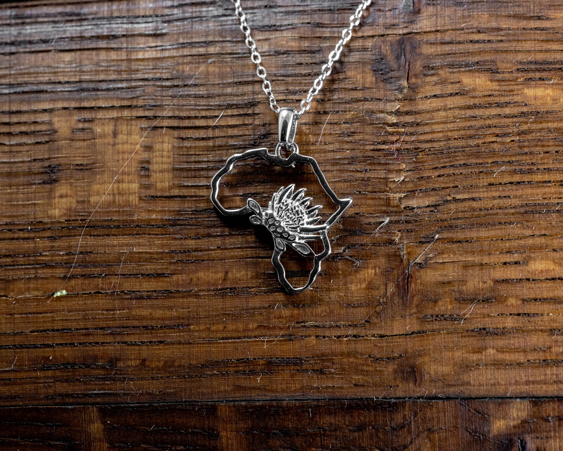 Diagonally set in a gold tracing of the map of Africa, South Africa's national flower, the exquisite protea, is artfully recreated in this gorgeous pendant. The petals and leaves are crafted in Sterling Silver, and the flower sits at an angle against the west coast of Africa. This is both a homage to Africa and the biodiversity of our wild continent.