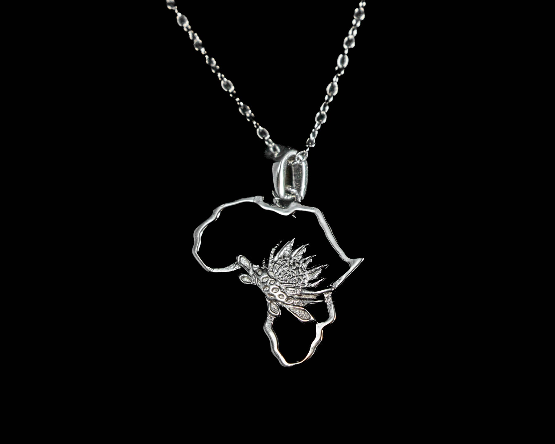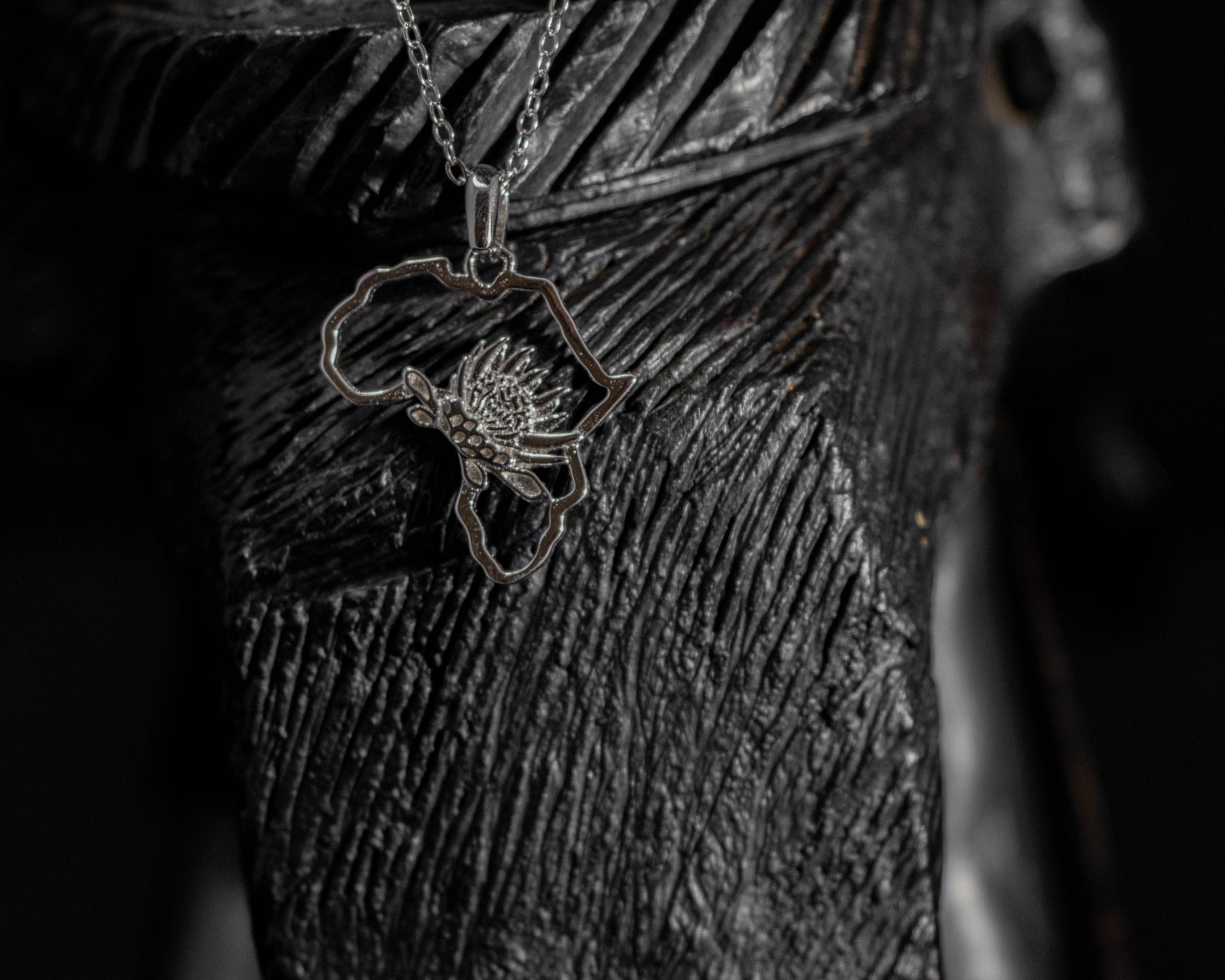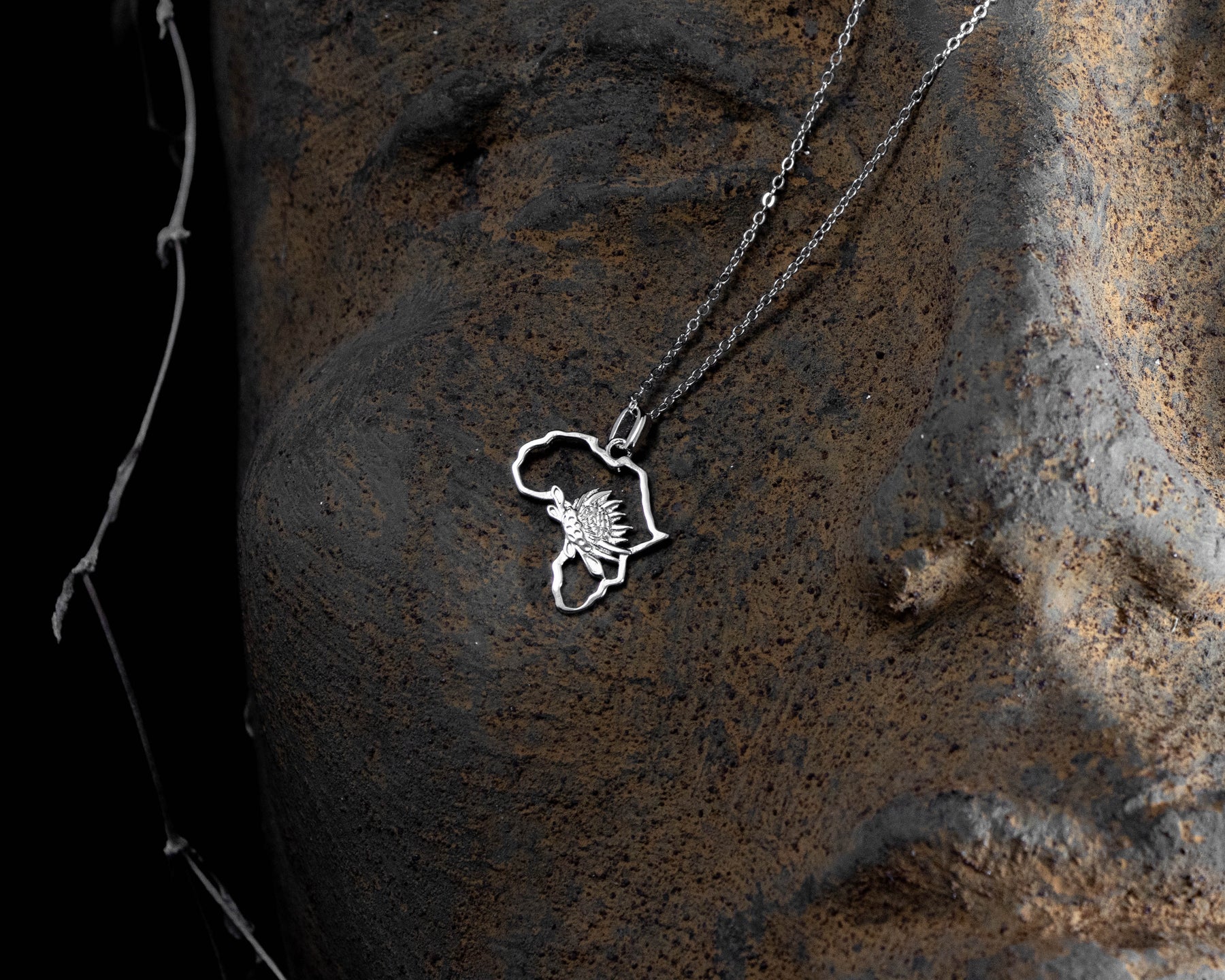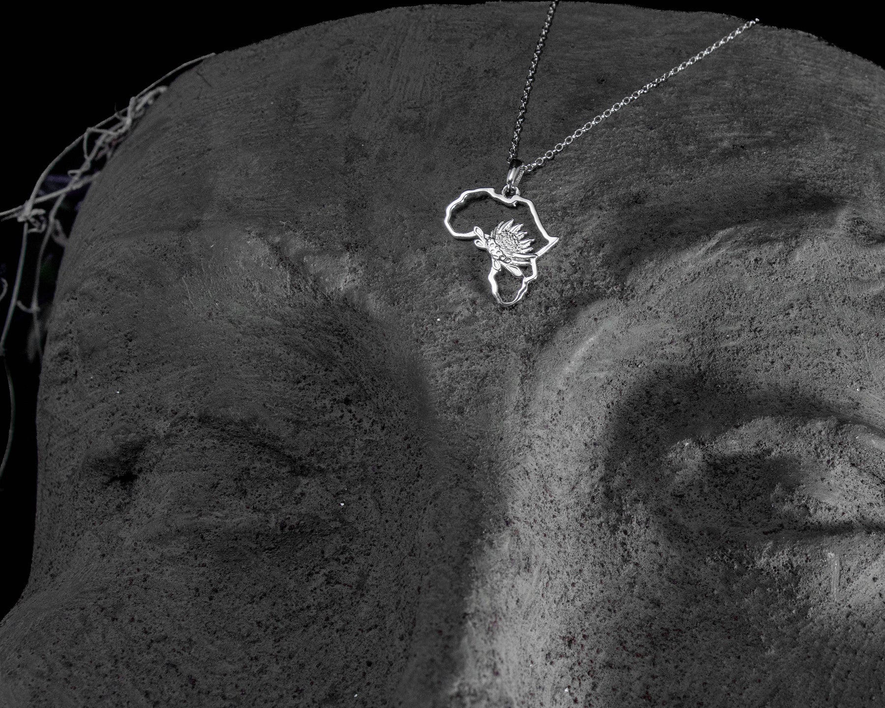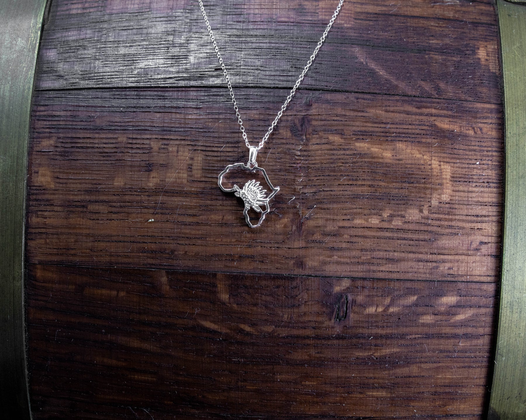 Diagonally set in a gold tracing of the map of Africa, South Africa's national flower, the exquisite protea, is artfully recreated in this gorgeous pendant. The petals and leaves are crafted in Sterling Silver, and the flower sits at an angle against the west coast of Africa. This is both a homage to Africa and the biodiversity of our wild continent.