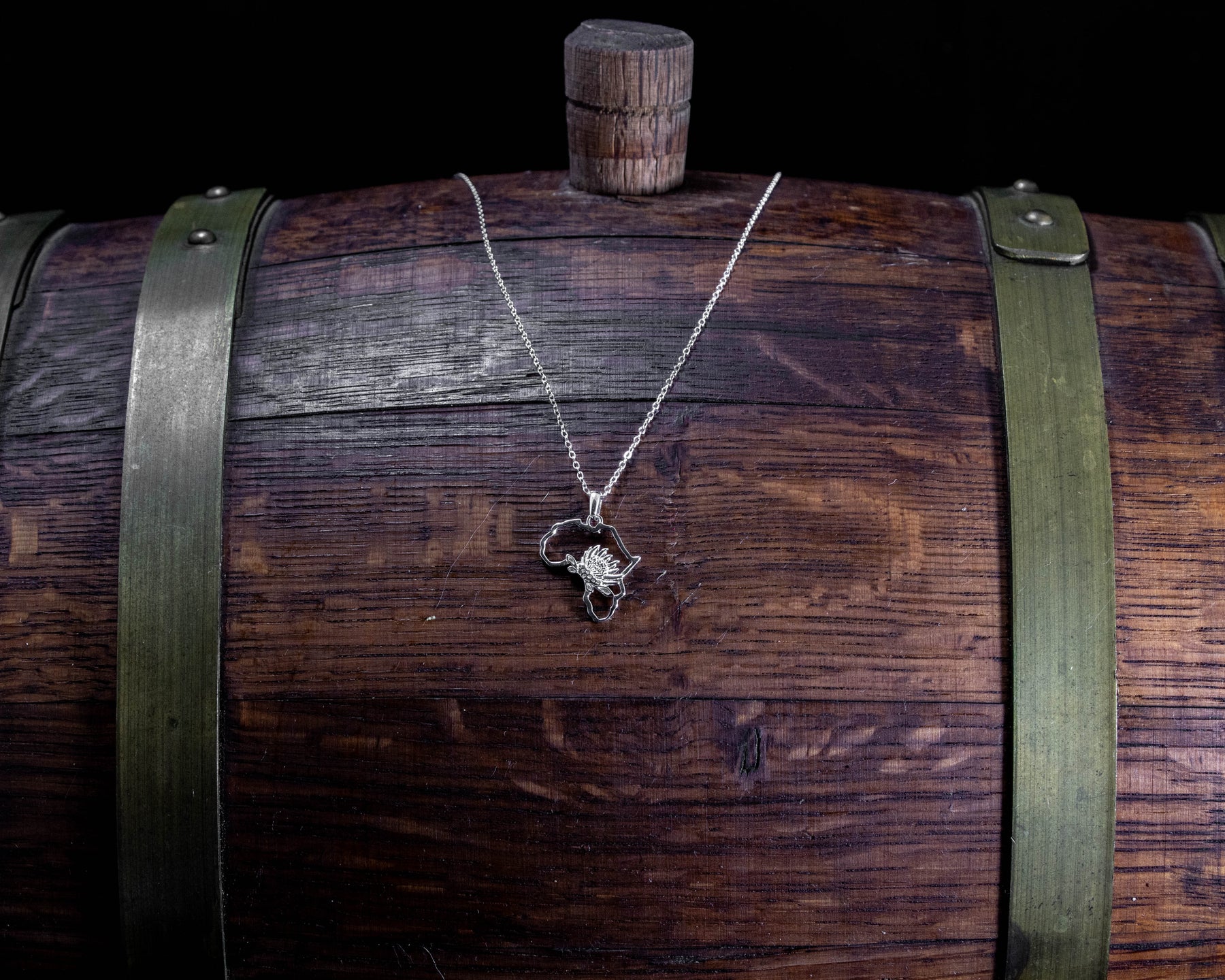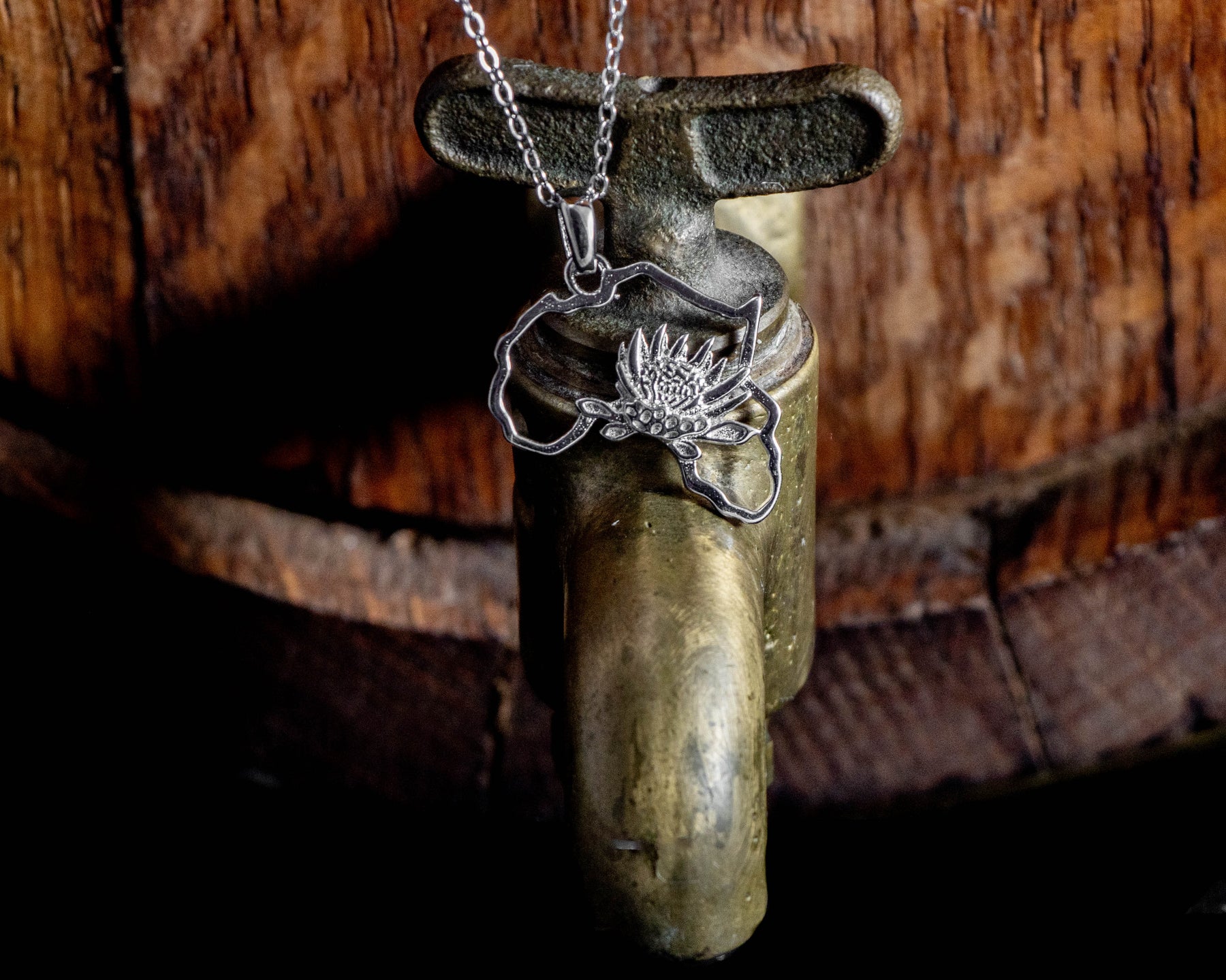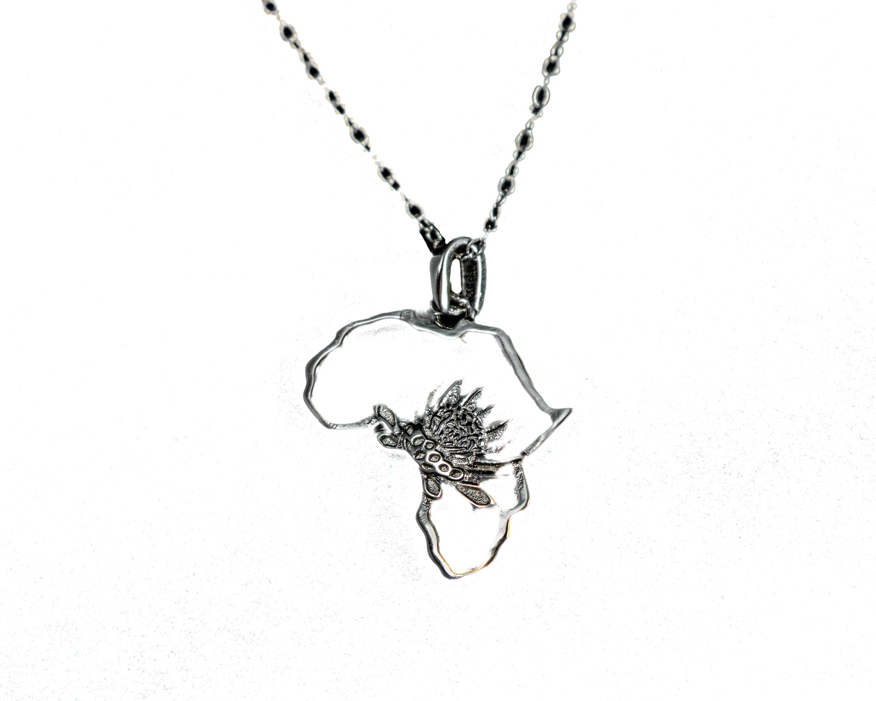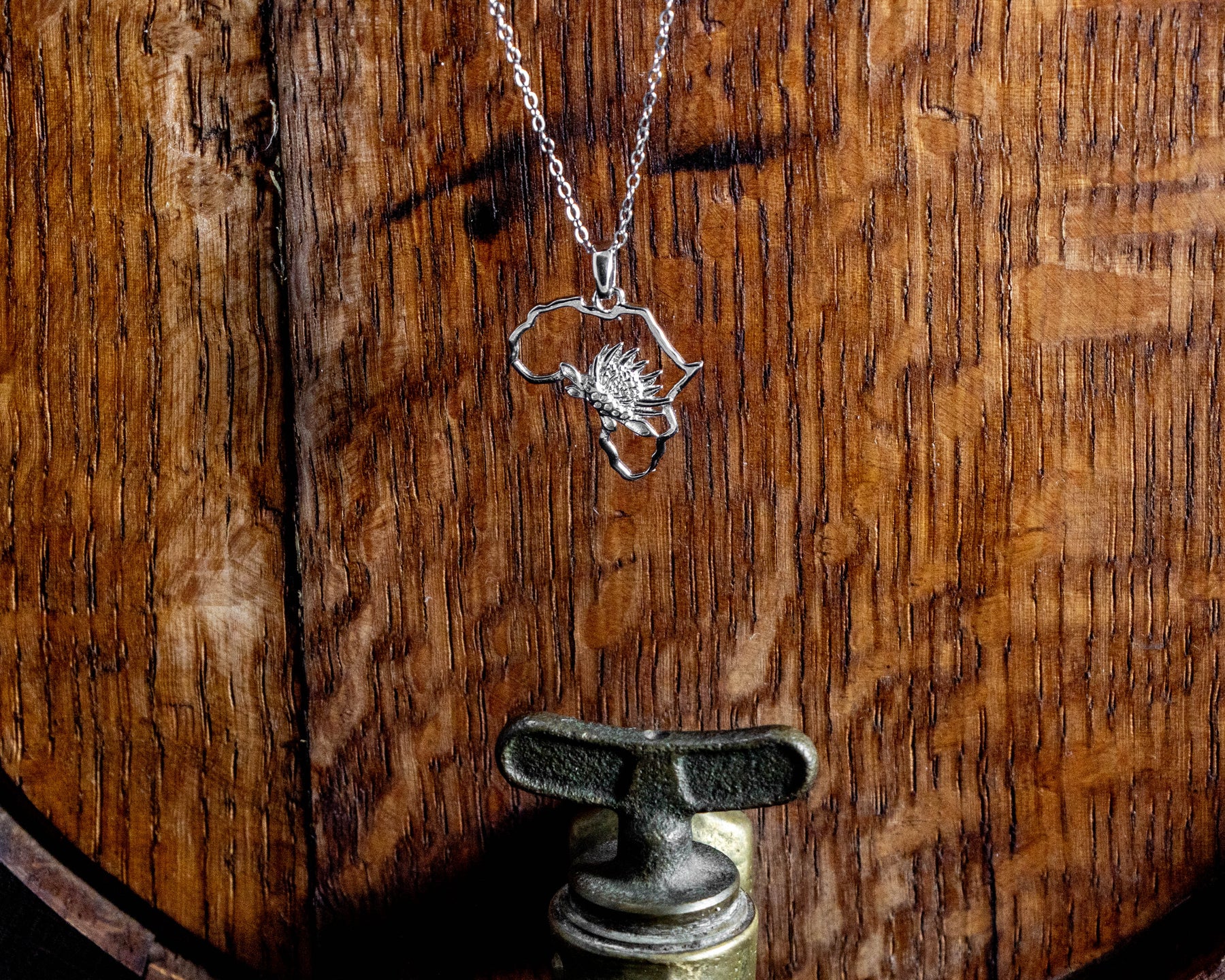 Diagonally set in a gold tracing of the map of Africa, South Africa's national flower, the exquisite protea, is artfully recreated in this gorgeous pendant. The petals and leaves are crafted in Sterling Silver, and the flower sits at an angle against the west coast of Africa. This is both a homage to Africa and the biodiversity of our wild continent.