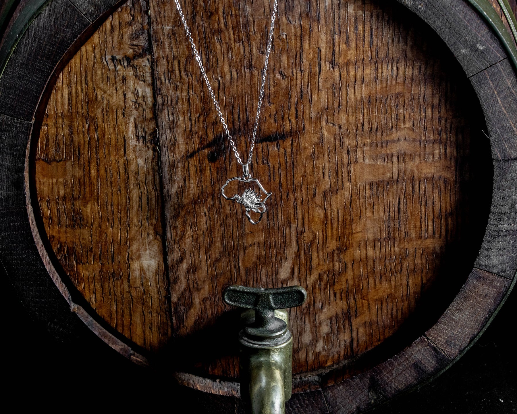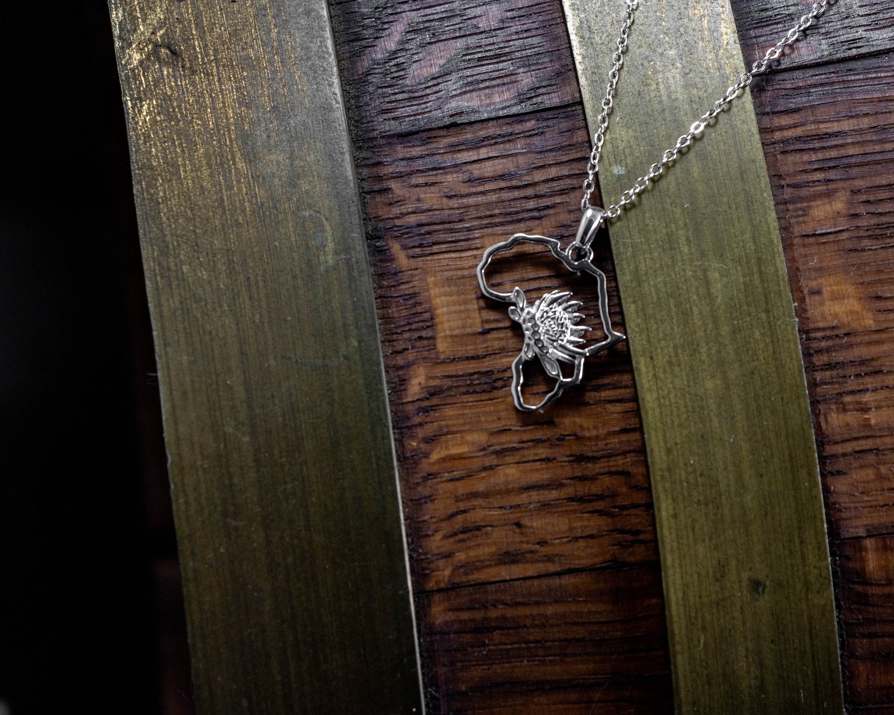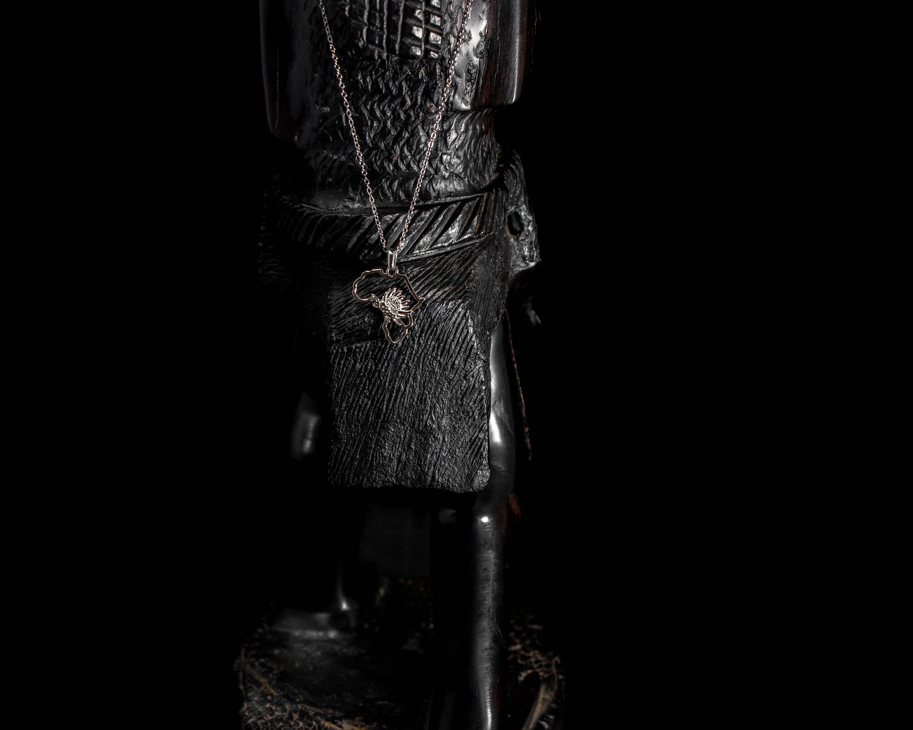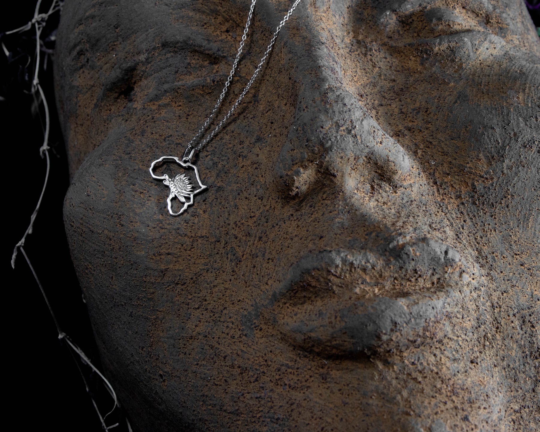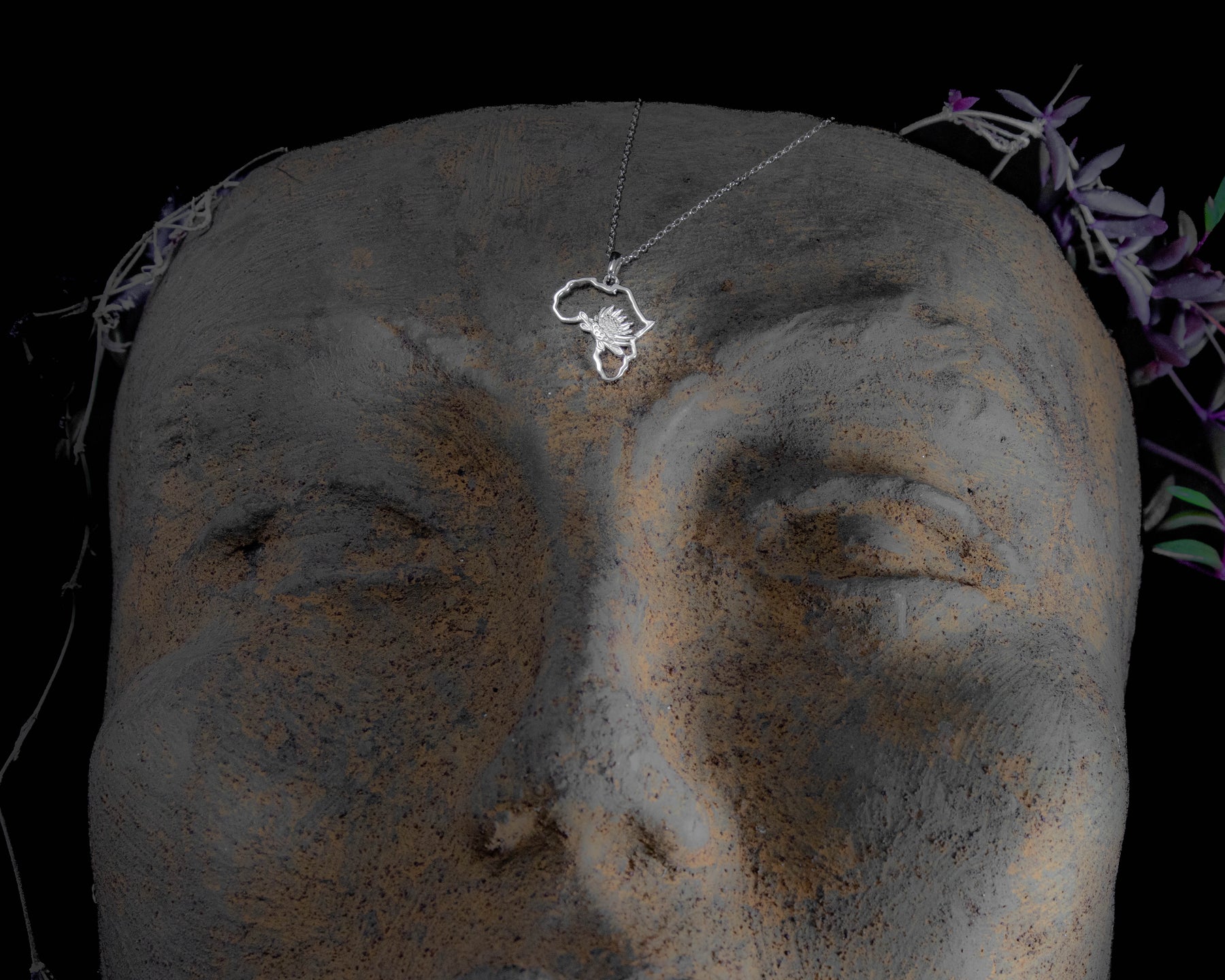Diagonally set in a gold tracing of the map of Africa, South Africa's national flower, the exquisite protea, is artfully recreated in this gorgeous pendant. The petals and leaves are crafted in Sterling Silver, and the flower sits at an angle against the west coast of Africa. This is both a homage to Africa and the biodiversity of our wild continent.